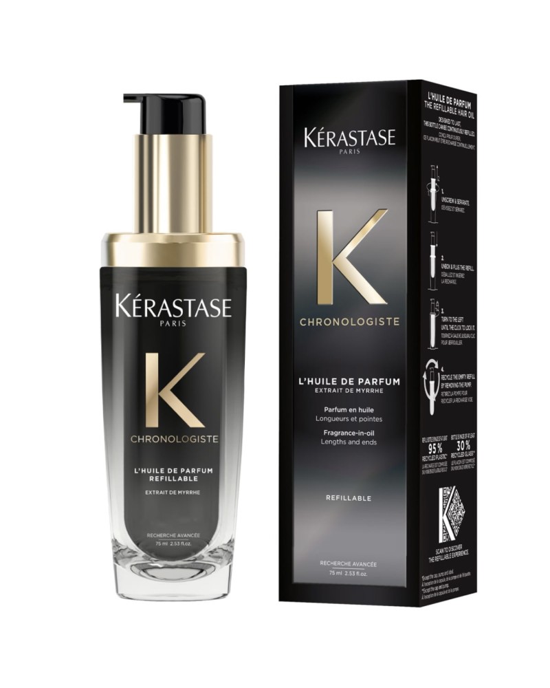 Odkryj olejek upiększający do włosów Chronologiste od Kérastase. Już kilka kropel olejku sprawia, że włosy są zrewitalizowane, nawilżone i pogrubione. Wyjątkowa formuła powstała na bazie połączenia ekstraktu z mirry i szlachetnych nut zapachowych: róży herbacianej, jasnego drewna i piżma. Olejek intensywnie odżywia włókna włosów i nadaje im promienny wygląd oraz zmysłowy zapach.